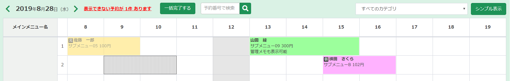 予約台帳(タイムテーブル)の表示を切替えます。シンプル表示にすると予約上の情報が非表示になります。