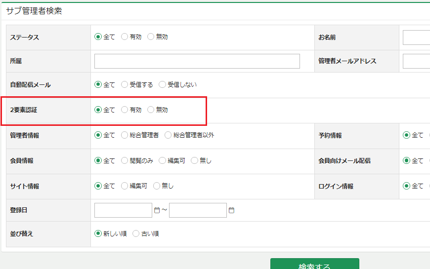 「サブ管理者検索」から「2要素認証」のステータスを「有効/無効」で選択して、検索することも可能です。