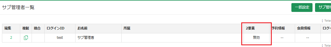 総合管理者が『サブ管理者サブ管理者編集』の「2要素認証」を”無効”にし、その後、サブ管理者自身で”有効”の設定を行ってください。