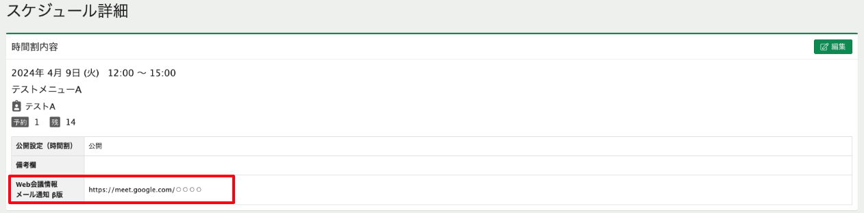 Googleカレンダーと連携をしていてメインメニューの「Google MeetのURLをメール通知」を”使用する”に設定している場合。対象メニューに予約が入るとスケジュール詳細に、Google MeetのWeb会議情報が表示されるようになります。