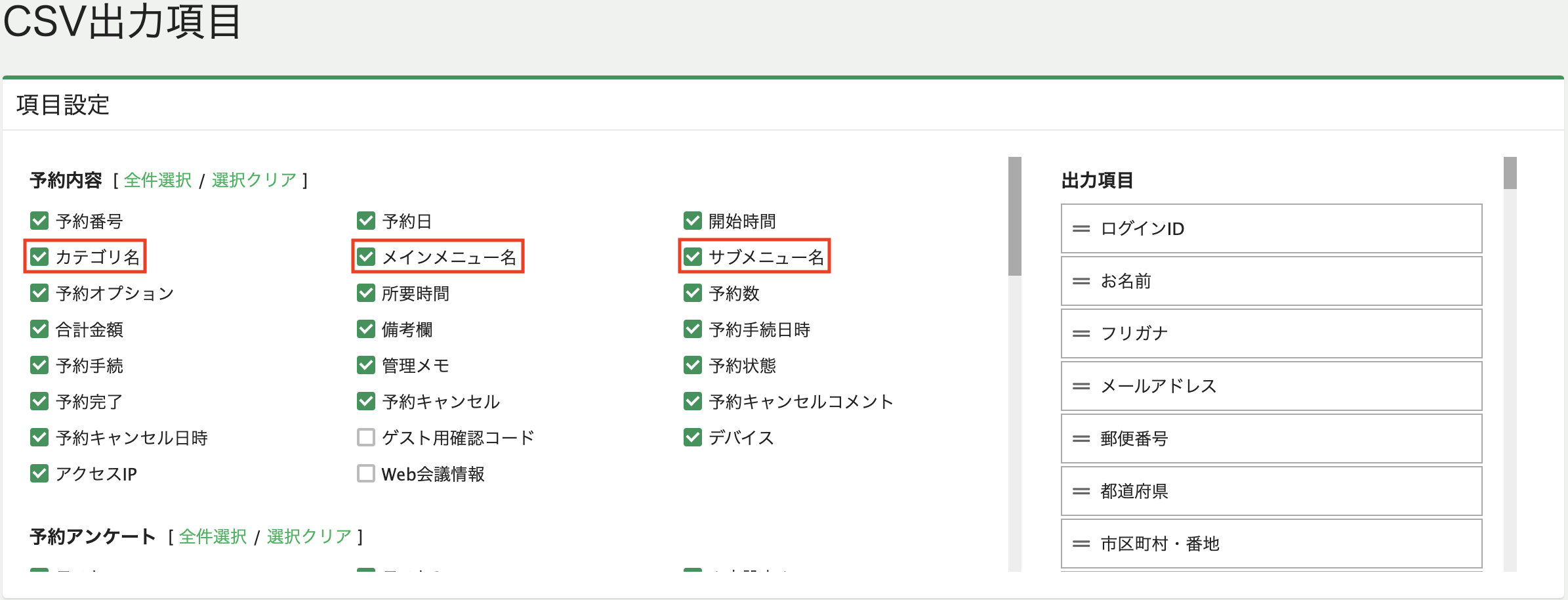 予約データ>CSV出力項目