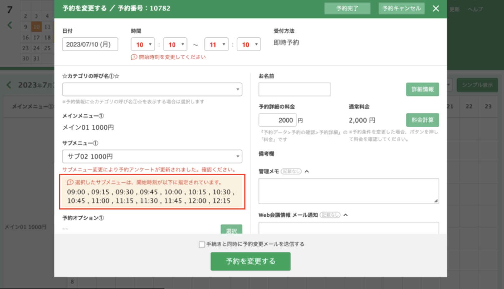 予約管理カレンダー上で予約の登録や変更を行う際に、サブメニューの開始時刻が一致しない時刻で予約を登録しようとするとエラーメッセージが表示されるのみで、何時から予約可能かは同一画面上から確認することが出来ませんでした。