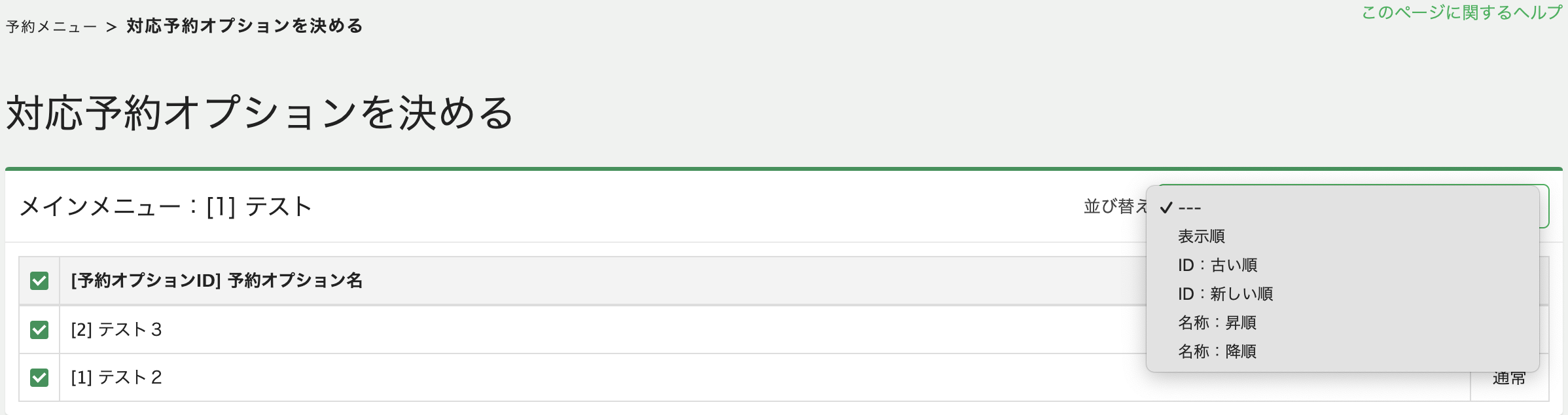 対象メニューに紐づいている予約オプションが上に表示されるため目視での確認がしやすくなり、予約オプションIDの登録順や名称順などで並び替えもできるようになるため、必要な対応予約オプションを探す際にもお役立ていただけます。