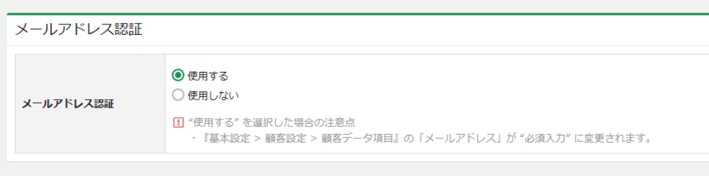 ・この機能は顧客データ項目の「メールアドレス」が”必須入力”の場合のみご利用いただけます。メールアドレス認証を”使用する”に設定すると「メールアドレス」が”必須入力”に変更されます。