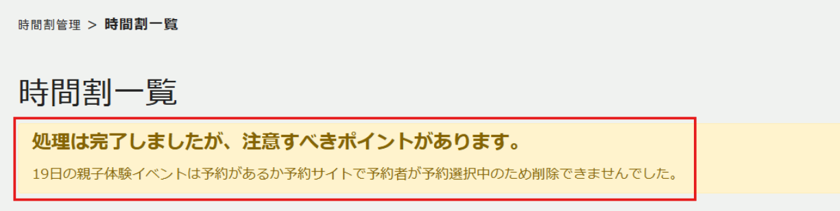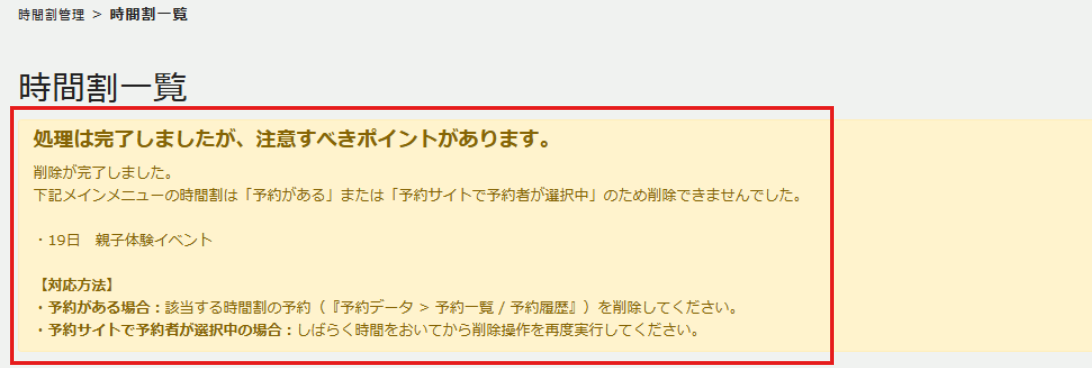 時間割を削除する際、予約サイトで予約手続き中である場合や予約データが存在していることにより削除できないデータが存在すると表示されるアラートメッセージの文言が変わり、削除できない原因と対処方法を分かりやすくします。