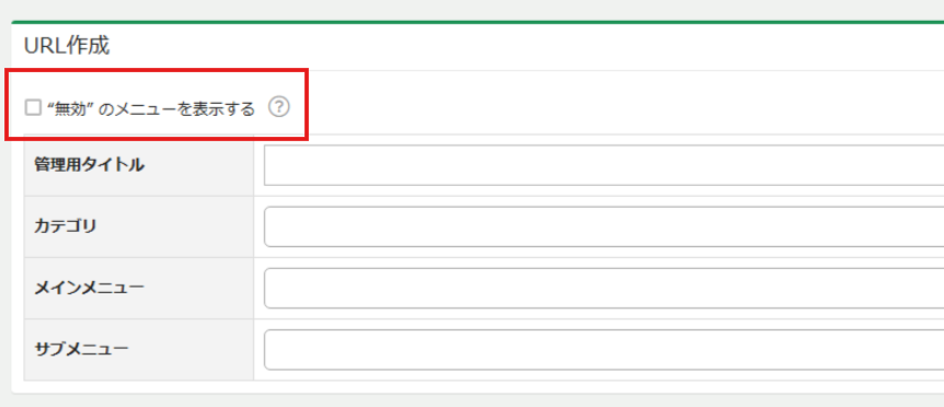管理画面からURL作成にて新規作成、または編集時、ステータスが”無効”のカテゴリ、メインメニュー、サブメニュー、担当の表示/非表示を切り替えられるようになり、表示した場合も”無効”の文字が表示されるようになります。