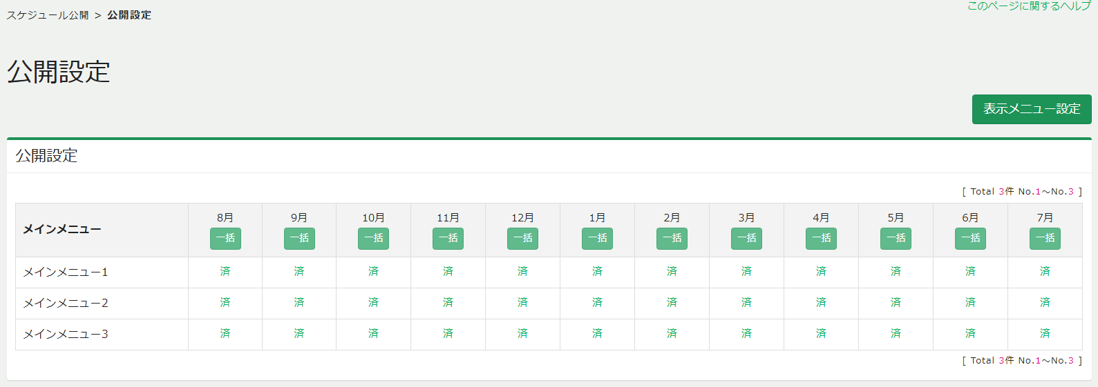 「スケジュール公開の自動処理」を有効にすると、公開設定に表示されているメインメニューの未公開になっている月は、公開処理を行わなくても自動的に公開(「未」→「済」)します。