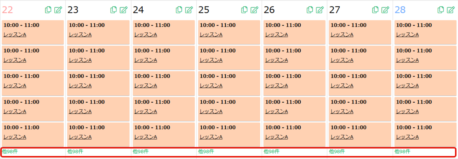 スクールタイプの時間割設定で、1日に100件を超える時間割がある場合は、 「他〇件」のリンクを表示し、クリックですべての時間割を確認できるようになります。