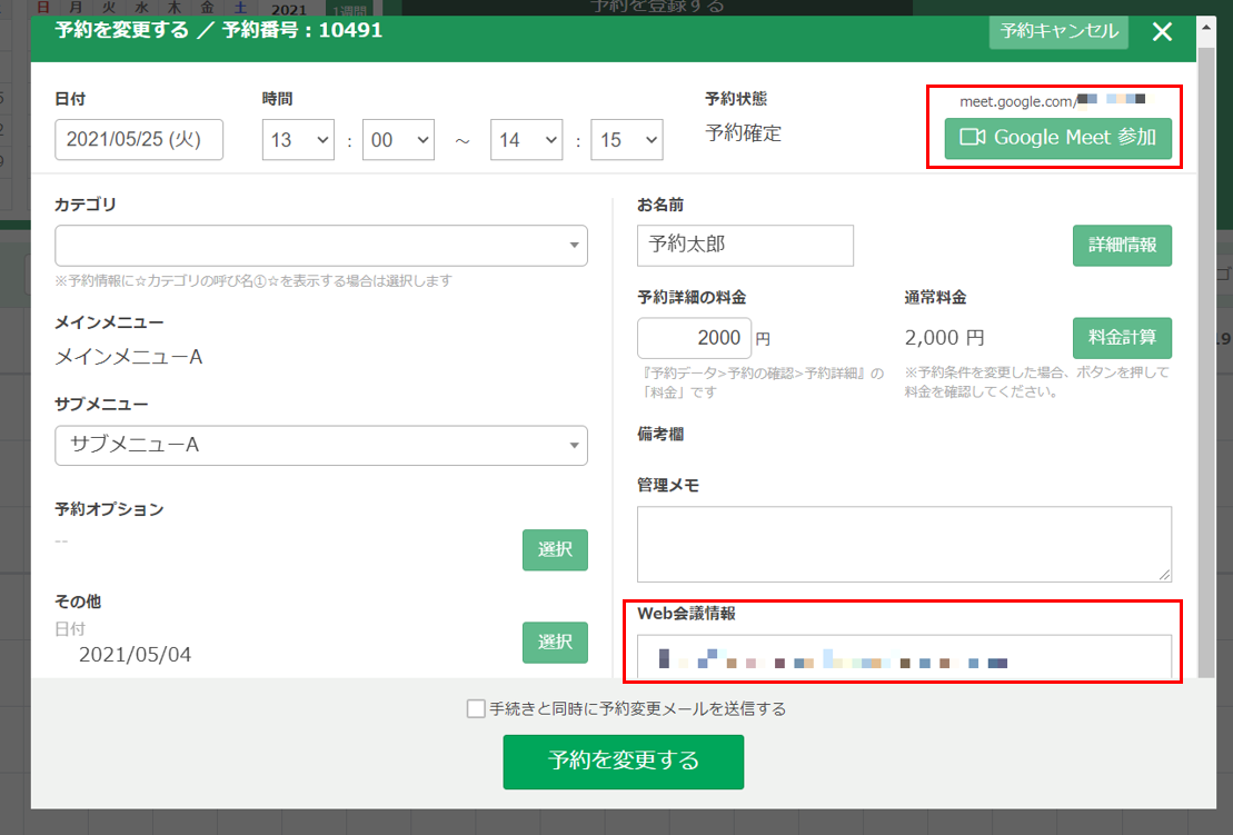 予約管理カレンダーの予約詳細画面からWeb会議のURLにアクセスすることができます。