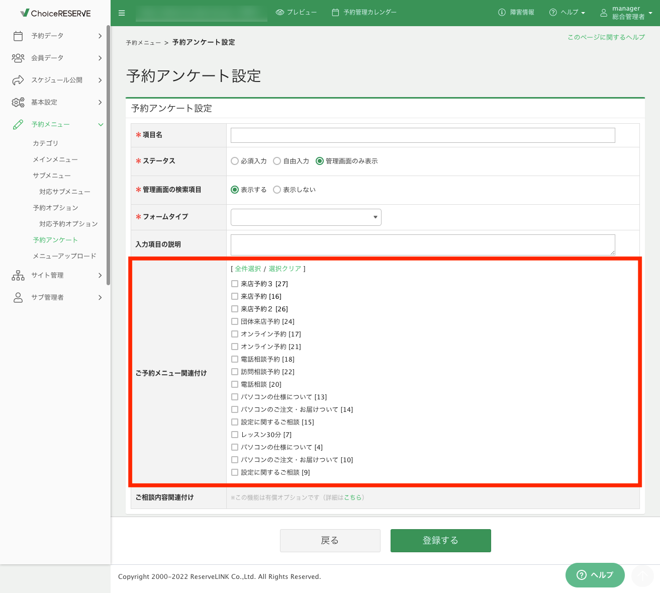 予約に関連づけられるメニューは「予約アンケート設定」のページに紐づけられており、ここから編集できるようになっていました。