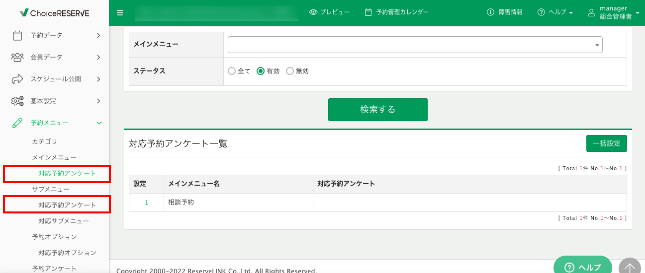 メインメニュー / サブメニュー の各配下に「対応予約アンケート」を追加しました。