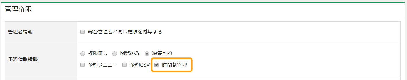 ●対象画面 : 管理画面>サブ管理者>サブ管理者編集「管理権限」“予約情報権限”