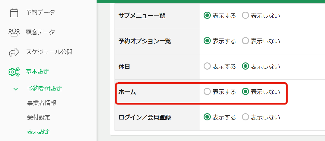 ●対象画面: 基本設定>予約受付設定>表示設定>ホーム