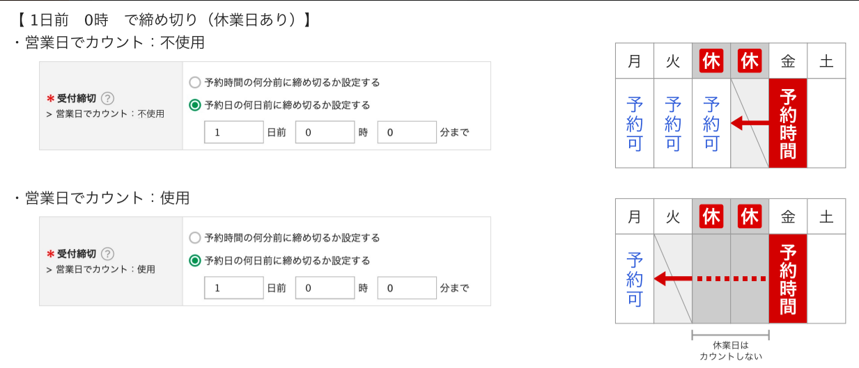 基本設定>予約受付設定>受付設定「受付締切 営業日でカウント」