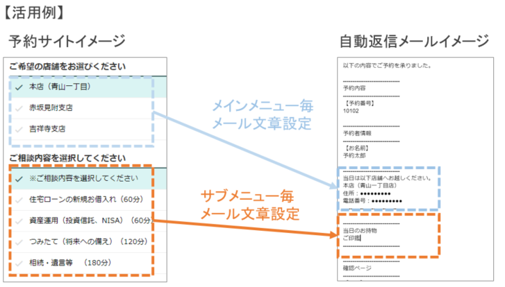 サブメニュー毎に持ち物や注意事項が異なる場合などに、自動配信メールに記載する内容を変更することができます。