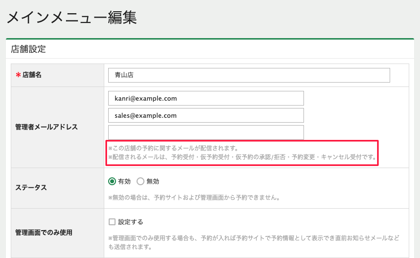 本機能は、オプション機能「メニュー毎メール送信先設定」をご利用中のお客様が対象となります。