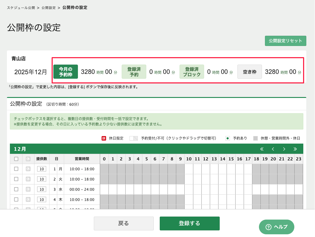 各メインメニューの公開枠設定画面で、1ヶ月の提供時間・予約時間・空き時間を把握できるようになりました。
