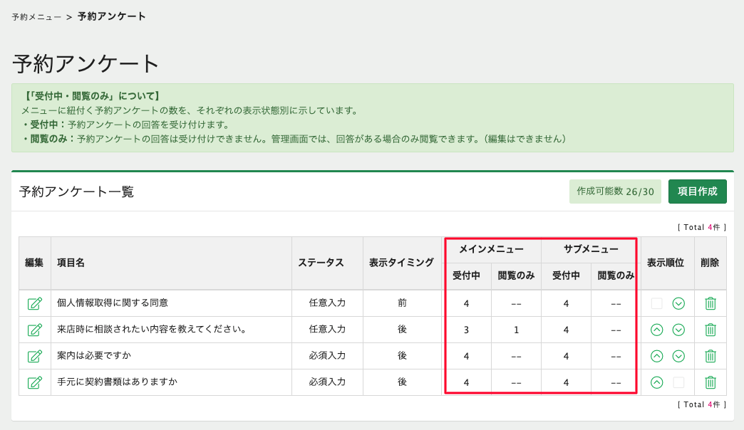 予約メニュー定>予約アンケート>[予約アンケート一覧]